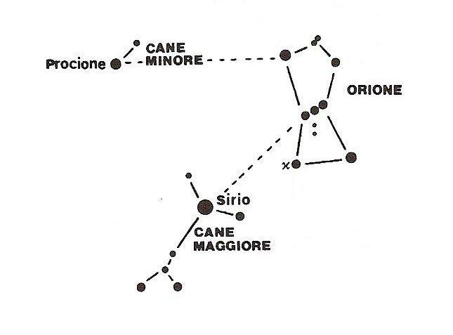 Prolungando verso sinistra l’allineamento fra Bellatrix e Betelgeuse si arriva su Procione, la stella più luminosa del Cane Minore. Il nome Procione deriva dal greco prokion, che significa “che precede il cane”, poiché sorge prima di Sirio, la stella principale del Cane Maggiore. I due Cani, secondo la leggenda, accompagnavano Orione durante la caccia, sua attività preferita.