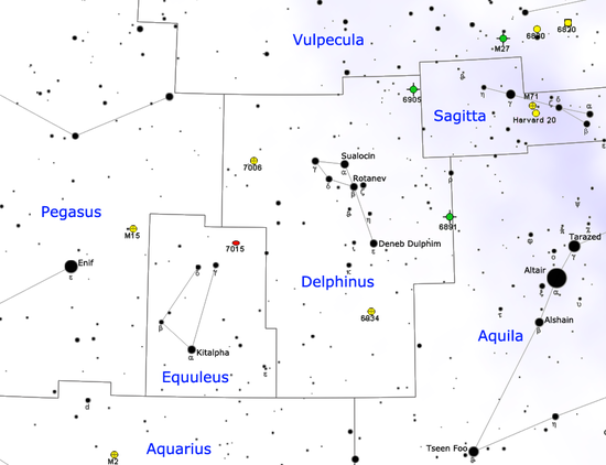 Il Delfino e il Cavallino sono due piccole ma antiche costellazioni, già citate da Tolomeo nell’Almagesto e poste tra l’Aquila e l’Acquario. La prima è facile da trovare: basta allungare di un paio di volte il segmento che congiunge Deneb e epsilon (ε) Cygni, ”l’ala destra” del grande Cigno, per arrivare al grazioso Delfino, dall’inconfondibile forma a rombo, un piccolo aquilone, con una quinta stellina che costituisce la coda del mammifero marino. Le cinque stelle principali hanno magnitudine compresa tra 3’9 e 4,4 e questa uniformità favorisce molto l’identificazione della costellazione. Secondo la leggenda, i delfini erano usati come messaggeri da Poseidone, dio del mare: non si sa a quale dei tanti citati nella mitologia la costellazione faccia riferimento. Forse quello che aiutò Poseidone nel corteggiamento della moglie, la sirena Anfitrite o forse quello, come riportato da Ovidio, che salvò la vita al poeta e musicista Airone. Questo abilissimo suonatore di lira, di ritorno da una serie di concerti in Grecia, fu assalito dai marinai e salvato da un delfino che lo prese sul dorso e lo portò a riva. Apollo, dio della musica e della poesia, mise il delfino tra le costellazioni insieme alla lira di Airone che è rappresentata dalla costellazione della Lira. Una simpatica storiella accompagna le stelle alfa (α) e beta (β) della costellazione, alle quali, nel 1814, Giuseppe Piazzi, direttore dell’osservatorio di Palermo, e il suo assistente Niccolò Cacciatore assegnarono i criptici nomi di Sualocin e Rotanev, senza commentare la strana scelta. Circa cinquant’anni dopo si scoprì che i due nomi letti al rovescio formavano le parole latine Nicolaus Venator, latinizzazione del nome di Niccolò Cacciatore. I due nomi non sono ufficialmente riconosciuti dall’Unione Astronomica Internazionale ma si perpetuano tra gli appassionati di astronomia per la loro origine curiosa.